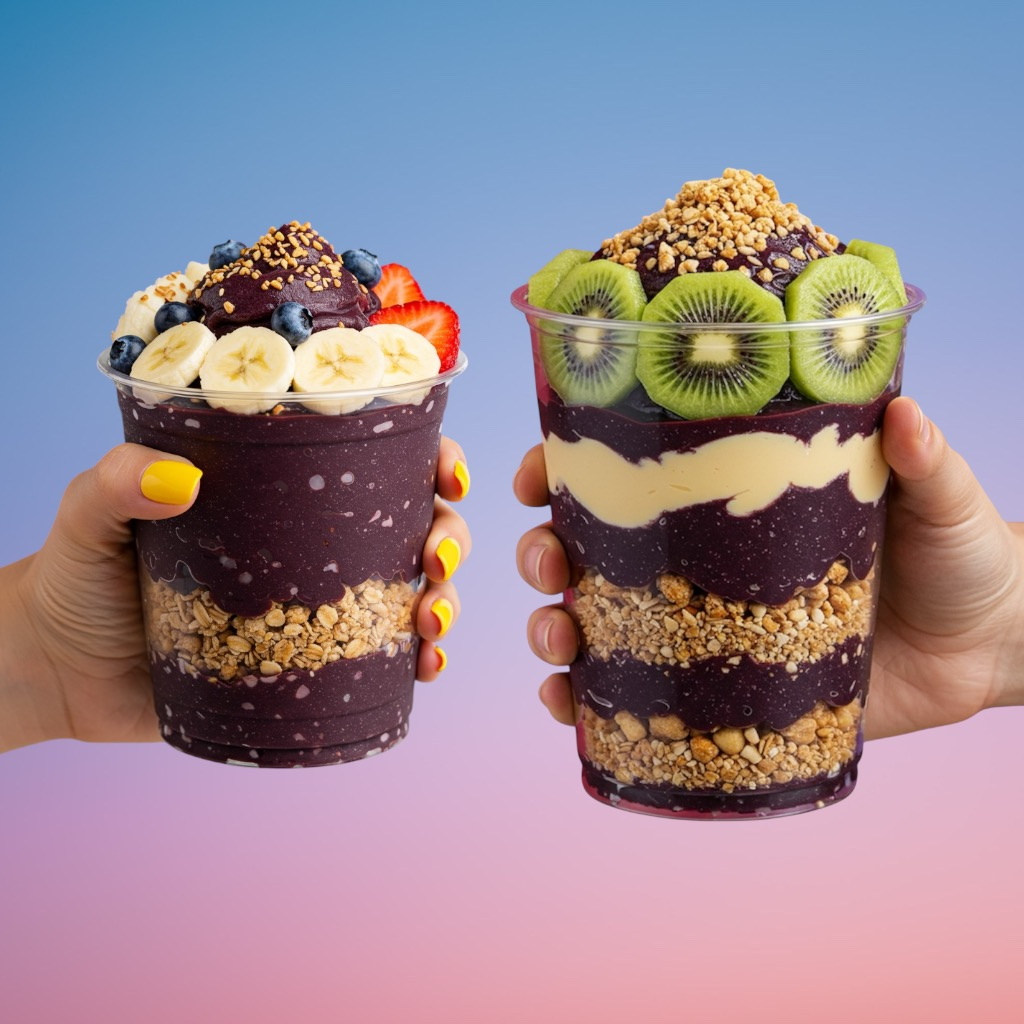 São dois Copos de 700ml de açaí cremoso, do jeitinho que você ama, com os acompanhamentos que escolher. Ideal para compartilhar com alguém especial ou garantir o refresco em dobro.