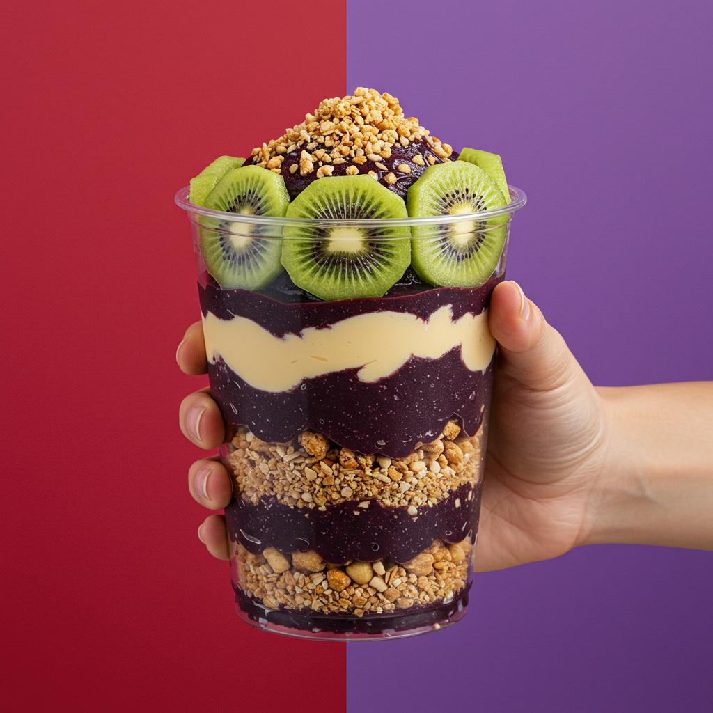 Açaí cremoso de 1,800 litros montado com camadas generosas de acompanhamentos crocante, frutas frescas e coberturas à sua escolha. Refrescante, do jeito que você gosta!